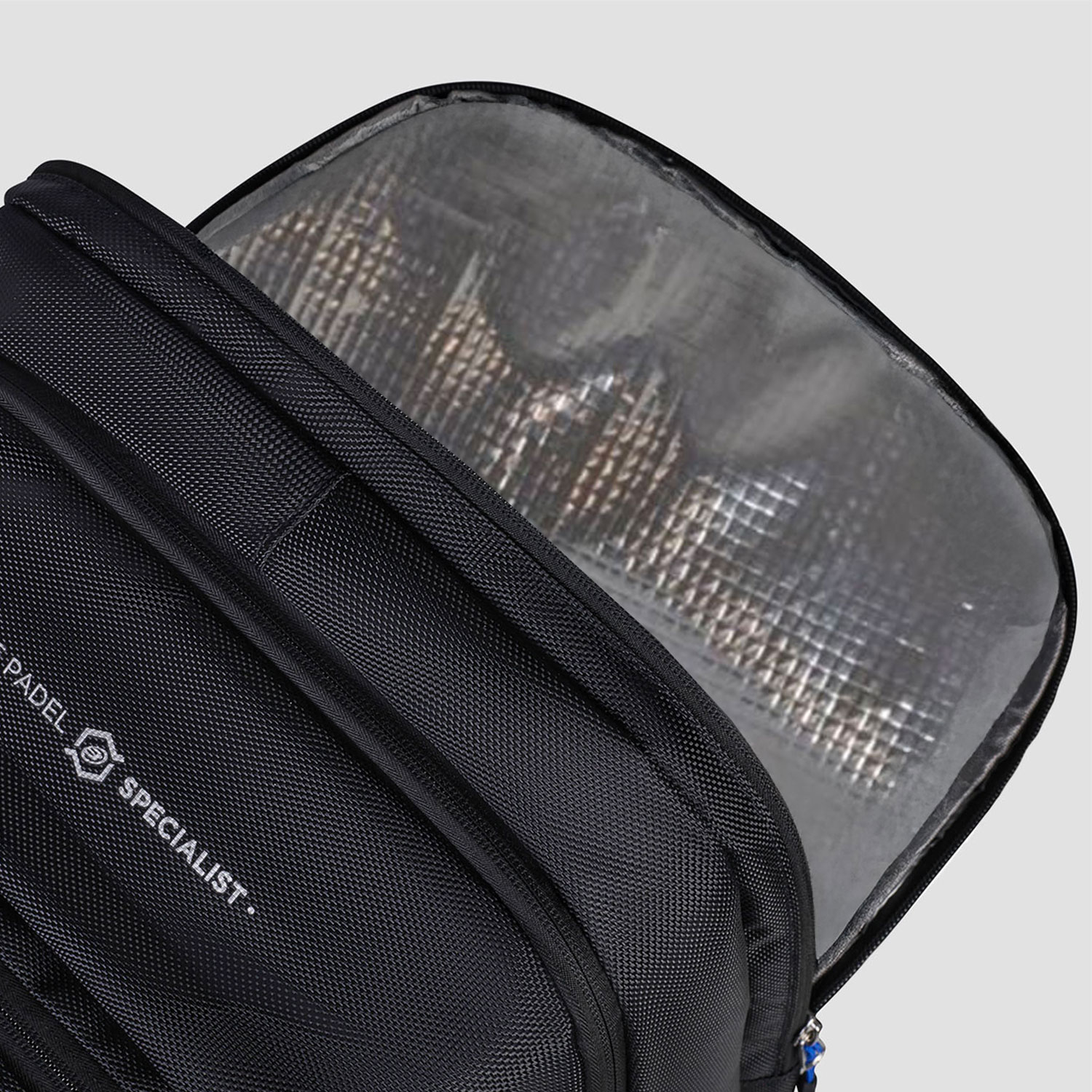 • Compartiment termic pe spate cu fermoar bidirectional, protejeaza rachetele de schimbari de temperatura